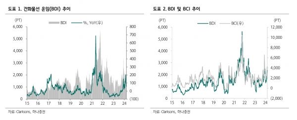 올해도 대형 선박인 Cape급 운임이 BDI를 좌우했는데 Cape급 운임지수(BCI)의 경우 2월 저점때는 일시적으로 2,000포인트 하회했으나 최근에는 4,000포인트를 기록 중이다. 1) 2월 중순 중국의 부동산 부양을 위한 유동성 공급책(LPR 5년물 25bp 인하) 발표와 2) 브라질의 우기 지연에 따른 철광석 수출 여력 개선 및 3) 춘절 이후 중국 철강 및 산업활동 재개에 따른 철광석과 석탄 수입 확대 기대감 등이 운임 상승을 견인한 것으로 판단된다. 4) 홍해 위기와 파나마 운하 통행 제한과 같은 지정학적 리스크도 운임에 긍정적으로 작용했다.