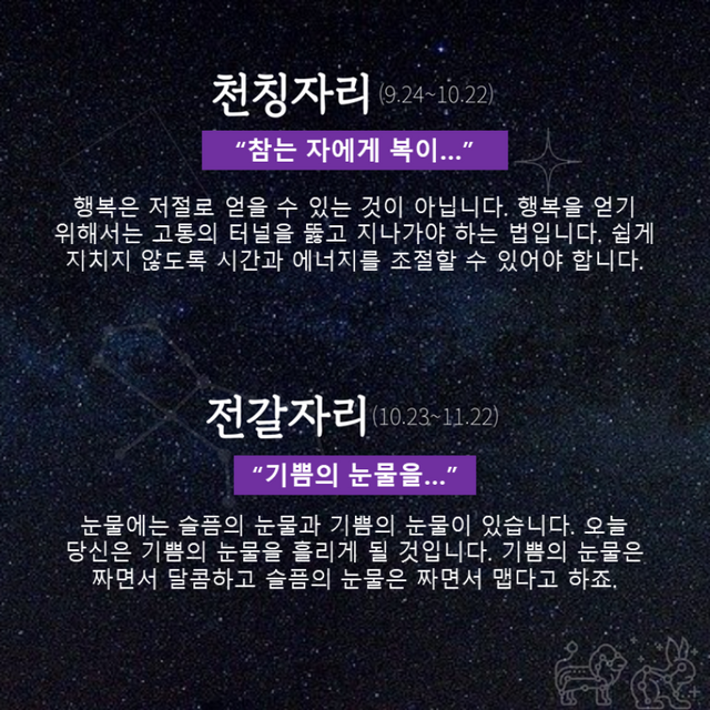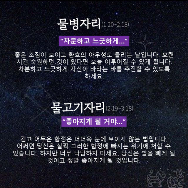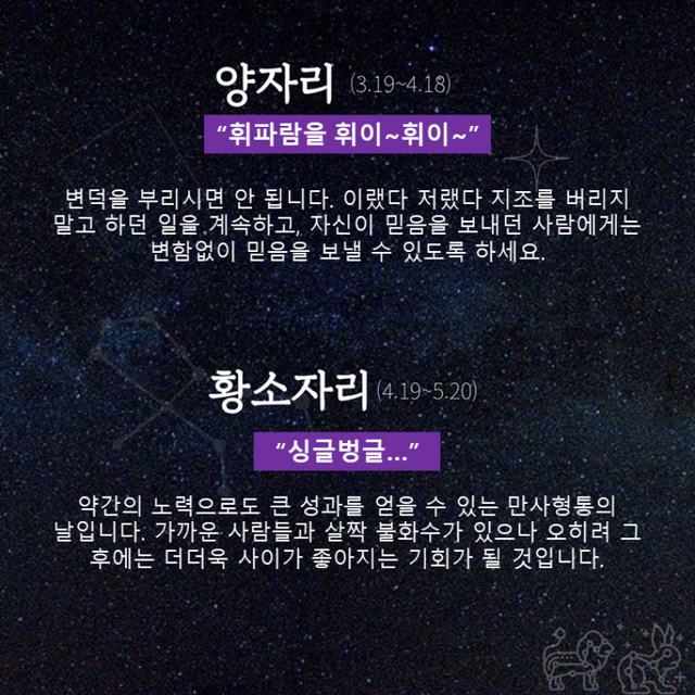 약간의 노력으로도 큰 성과를 얻을 수 있는 만사형통의 날입니다. 가까운 사람들과 살짝 불화수가 있으나 오히려 그 후에는 더더욱 사이가 좋아지는 기회가 될 것입니다.