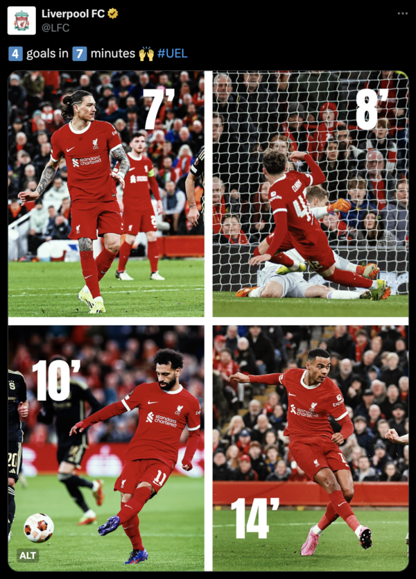 15일(한국시간) 영국 리버풀의 안필드에서 2023-2024 유럽축구연맹 유로파리그 16강 2차전을 치른 리버풀이 스파르타프라하에 6-1 대승을 거뒀다. 1차전에도 5-1로 프라하를 대파한 리버풀은 1, 2차전 합계 11-2로 여유롭게 8강에 올랐다.