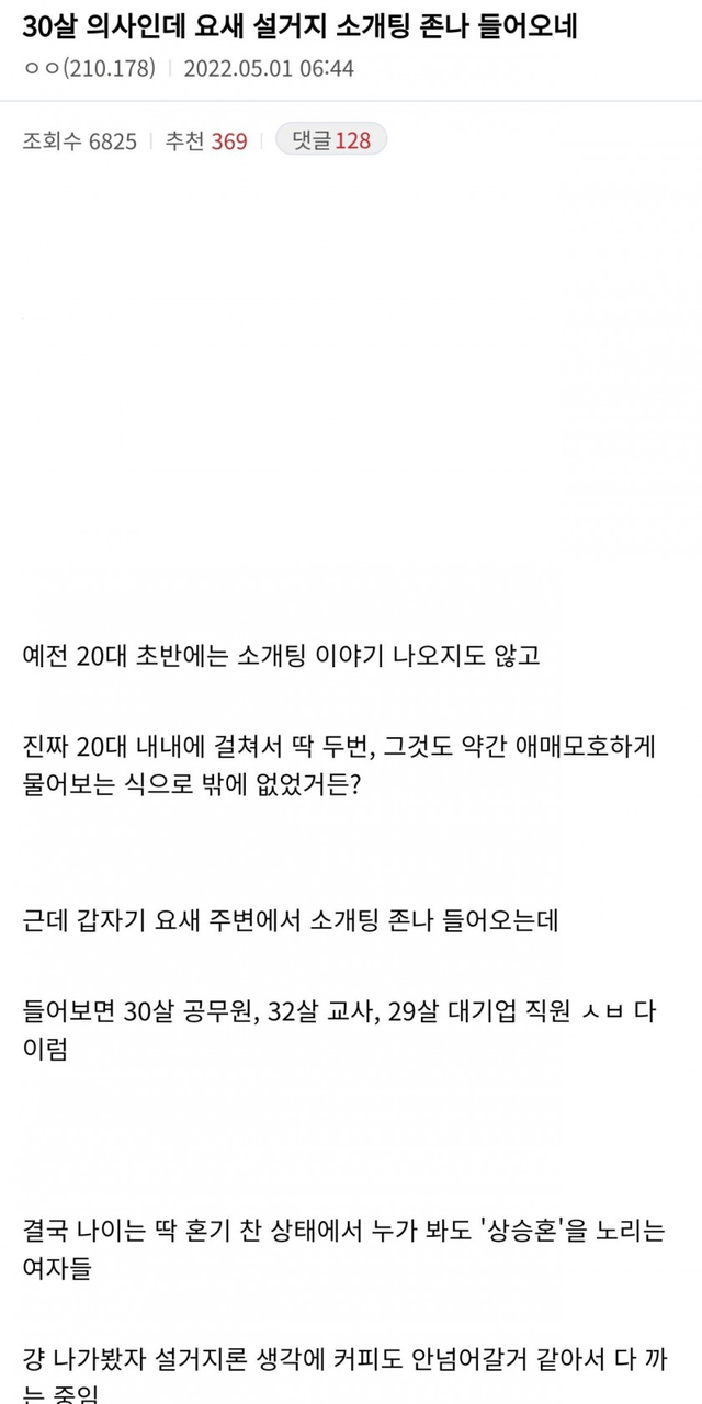 보통 20대 젊을때 공부를 해서 시간이 없었던 아니면 못생겨서 소개팅이 안들어왔던 뭐던 간에