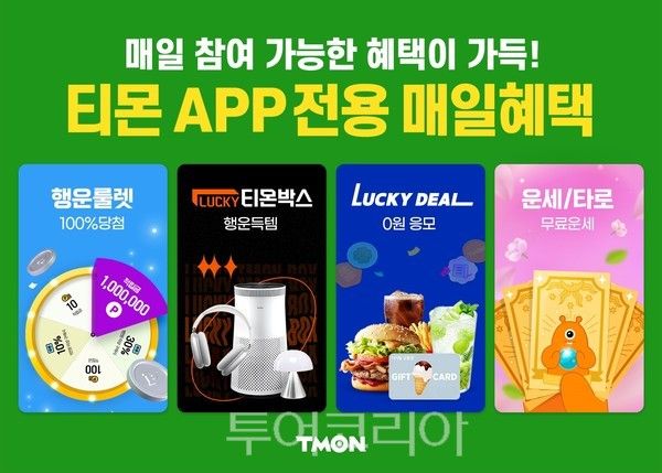 먼저, 티몬은 매일 특별한 혜택을 누릴 수 있는 앱전용 이벤트 ‘매일혜택’을 준비했다. 봄맞이 쇼핑을 즐기는 고객들을 위해 적립금·할인쿠폰, 경품 라인업 등을 기존 대비 강화하고 풍성한 혜택을 전한다.