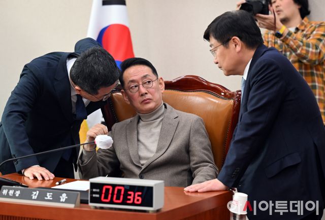 김도읍 법사위원장과 여야 간사인 정점식·소병철 의원이 15일 국회에서 해병대 수사 외압 의혹을 받고 있는 이종섭 전 국방부 장관 현안과 관련해 더불어민주당의 개회 요구로 열린 법제사법위원회 전체회의에서 대화를 하고 있다. /송의주 기자
