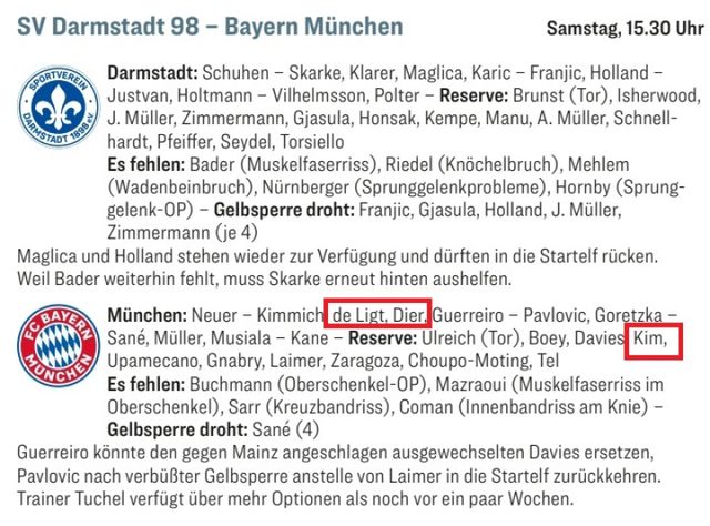 독일 매체 키커 역시 김민재의 선발 가능성을 낮게 점쳤다. 매체는 지난 14일 다름슈타트-뮌헨전 예상 선발 명단을 공개했는데, 김민재는 벤치 명단에 포함됐다. 대신 다이어-더 리흐트가 다시 한번 나설 것이라 전망했다. 이외 마누엘 노이어·조슈아 키미히·라파엘 게레이로·알렉산다르 파블로비치·레온 고레츠카·르로이 사네·토마스 뮐러·자말 무시알라·해리 케인이 나설 것이라 내다봤다.