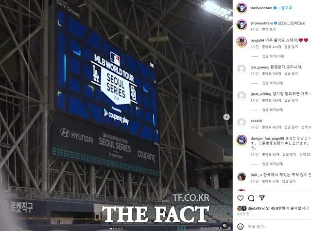 오타니는 이날 서울 도착 후 밤 늦게 인스타그램을 통해 개막전이 열리는 고척스카이돔 내부 모습을 영상에 담아 릴스로 올리는 등 메이저리그 서울시리즈에 대한 팬들의 관심을 지속적으로 유도했다. 여의도 소재 호텔로 이동해 여장을 푼 오타니와 다저스 선수들은 16일부터 서울에서 본격적으로 공식 일정을 소화한다.