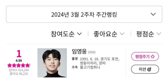 아이돌차트에 따르면, 지난 3월 8일부터 3월 14일까지 집계된 3월 1주 차 평점랭킹에서 임영웅은 41만 4,244표를 얻어 최다득표를 기록했다.