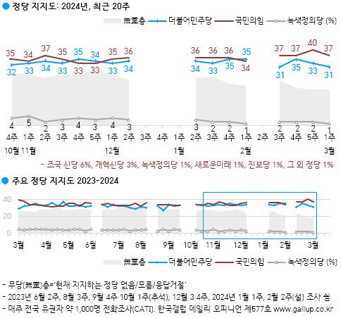예를 들면 한국갤럽이 지난 8일 발표한 3월 첫째 주(5~7일) 전화조사원 인터뷰(CATI) 전국 정당 지지율은 국민의힘(37%)이 더불어민주당(31%)보다 약 6%포인트 높은 것으로 나타났다. 무당층은 17%로 집계됐다. 반면 친야 성향 방송인 김어준 씨가 운영하는 ‘여론조사꽃’이 지난 8~9일 실시한 CATI에선 민주당(42.8%)이 국민의힘(33.9%)에 약 9%포인트 앞섰다. 서로 약 15%포인트의 격차를 보인 것이다.(표본오차 95% 신뢰수준 ±3.1%포인트. 자세한 사항은 중앙선거여론조사심의위원회 홈페이지 참조)