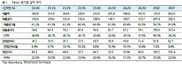 16일 이상수 하이투자증권 연구원에 따르면 화낙의 지난해 3분기 영업이익은 전년 동기 대비 22.1% 줄어든 408억엔을 기록했다. 같은 기간 매출액은 10.1% 감소한 1978억엔으로 집계됐다. 이는 고객사들의 투자 수요 둔화와 재고 조정에 따른 주문 감소 영향이다.