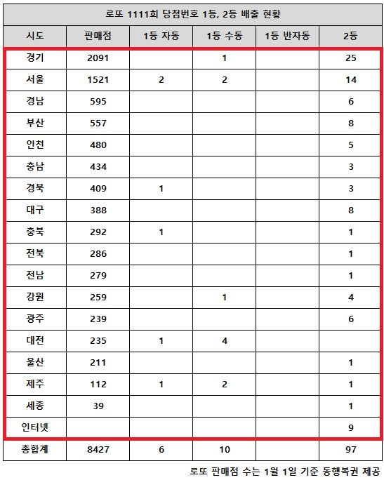 로또 1111회 당첨번호 조회 결과 1등을 배출한 지역은 전국 17개 시도 중 인구에 비례해 로또복권 판매점이 가장 많은 경기 2091곳 중 1곳(수동) 비롯해 서울 1521곳 중 4곳(자동 2곳·수동 2곳), 경북 409곳 중 1곳(자동), 충북 292곳 중 1곳(자동), 강원 259곳 중 1곳(수동), 대전 235곳 중 3곳(자동 1곳·수동 2곳), 112곳인 제주에서는 2곳(자동 1곳·수동 1곳)이다.