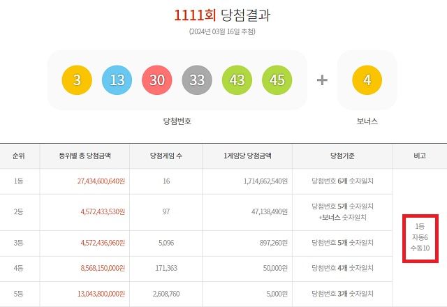 로또1111회 1등 당첨번호 조회 결과는 '3, 13, 30, 33, 43, 45' 등 6개이며 각 17억1466만원씩 당첨금을 받는다. 1111회 로또 당첨번호 2등 보너스 번호는 '4'이다.