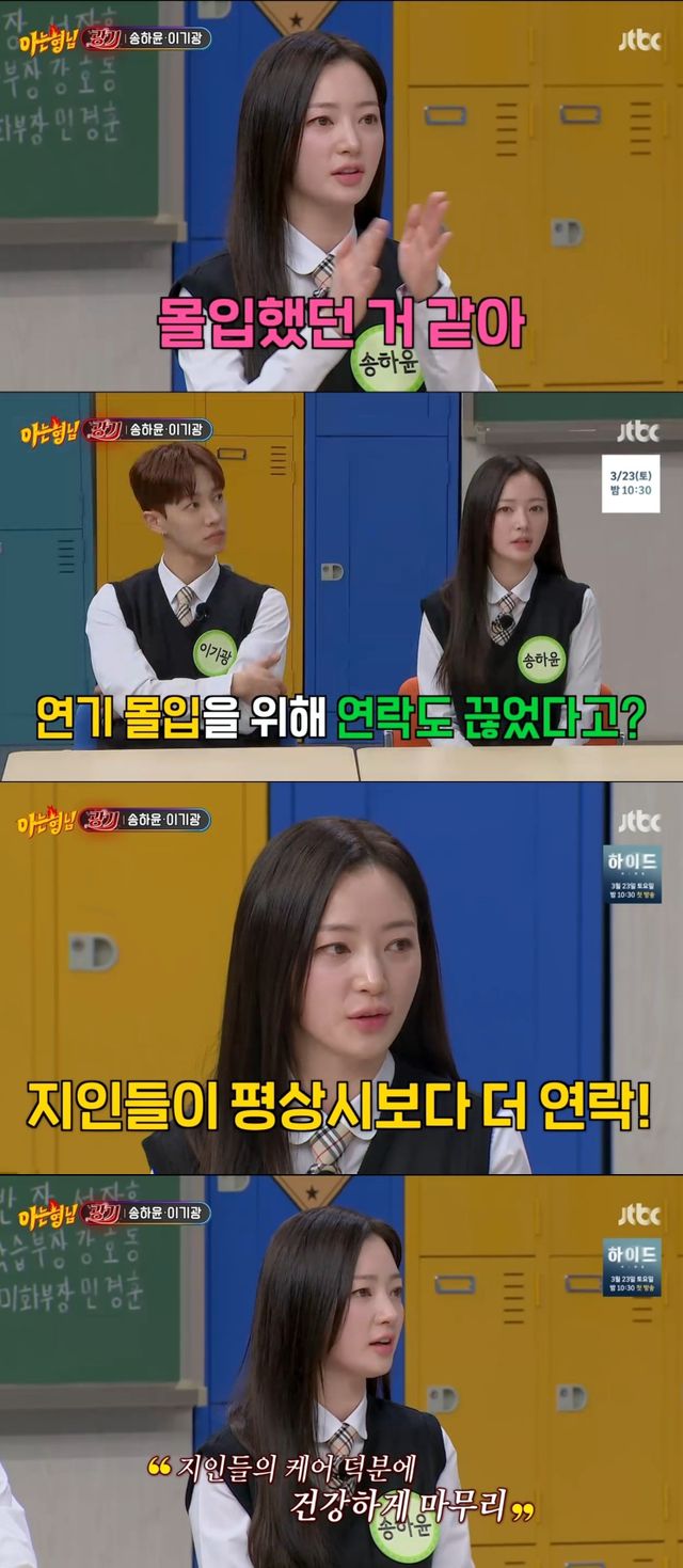 이어 송하윤은 "단절을 하면 할수록 지인들이 연락을 더 많이 해줬다"고 알리며 과몰입으로부터 송하윤을 지키기 위한 지인들의 노력 덕붙에 건강하게 드라마를 마무리한 것에 대한 고마움을 전하기도 했다.