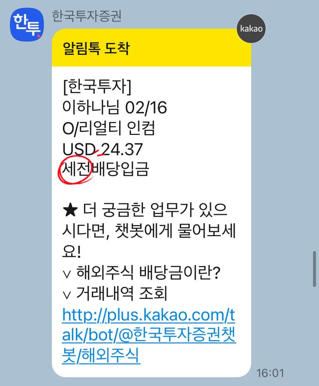 그래서 배당금이 입금될 때 '세전배당입금'이라고 표시가 되어있답니다.
