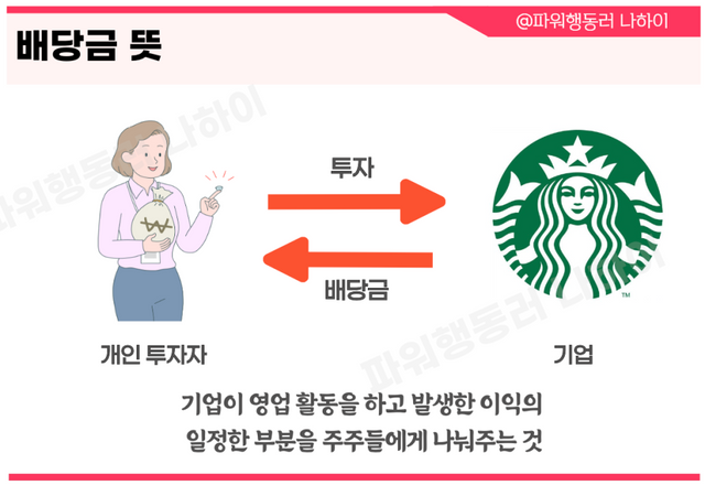 만약 내가 스타벅스 주식에 투자를 했다면 스타벅스는 투자를 받은 돈으로 열심히 일을 하고, 배당일에 주주들에게 수익을 나눠주게 됩니다.