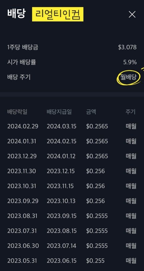 뭔가 월마다 배당금을 받으면 더 기분이 좋은 것도 있어서, 저는 월 배당인 리얼티인컴을 투자했는데요.