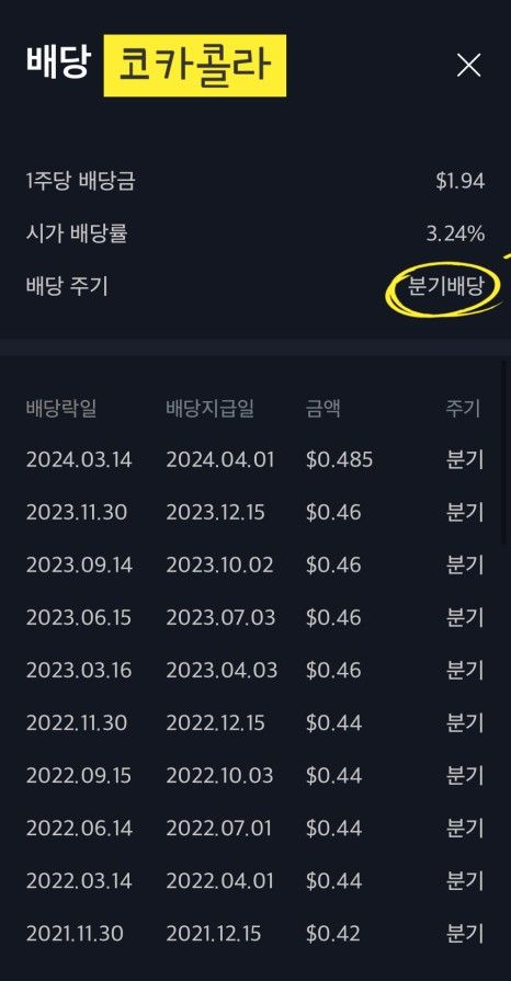현재 제가 투자하고 있는 리얼티인컴과 코카콜라 검색시 각각 월배당, 분기배당으로 표시 되어있는 걸 볼 수 있습니다.