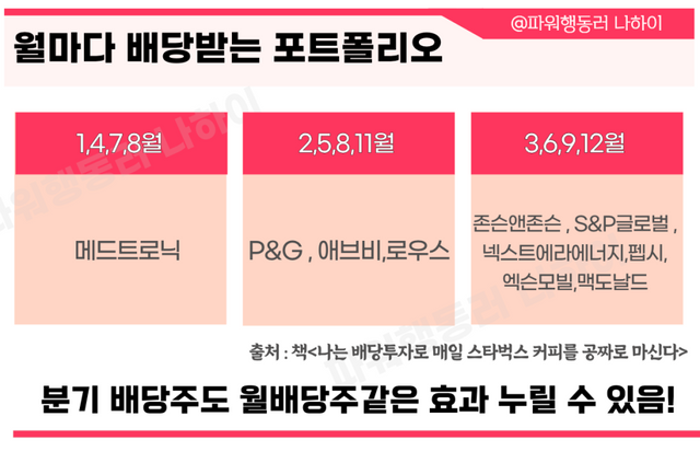 그 외에도 분기별인 배당주의 경우 배당 지급월이 다른 몇 개 기업을 선정해 투자포트폴리오를 만들면 월배당과 같은 효과를 볼 수 있어요.