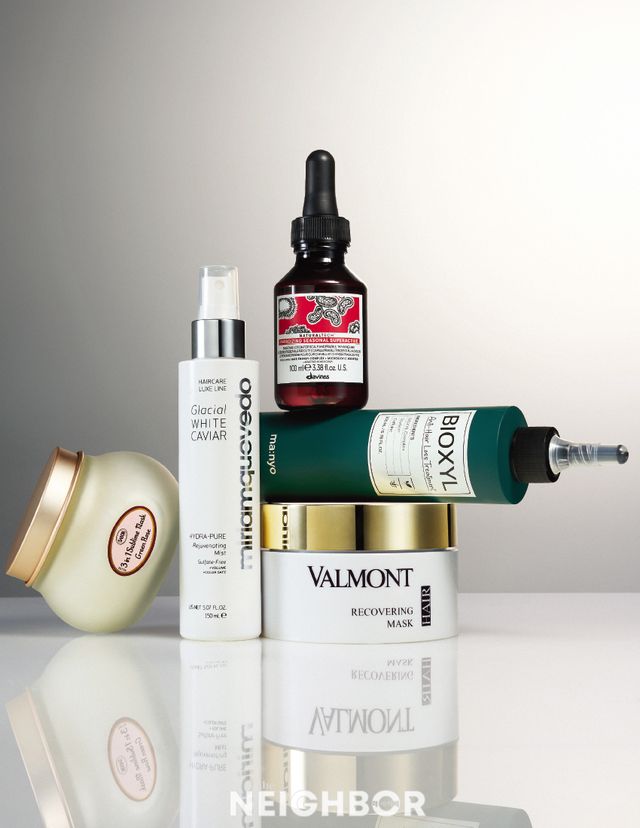 (왼쪽부터) Sabon 진귀한 3가지 오일과 시어버터 성분이 갈라지고 손상된 모발에 즉각적인 보습막을 형성해 머릿결을 촉촉하게 가꾼다. 헤어 서브라임 마스크 3 in 1 그린로즈 200ml 5만3000원. Miriamquevedo 민감한 두피를 위한 수분 공급 미스트로 두피 열을 즉각적으로 내려준다. 글래셜 화이트 캐비어 하이드라퓨어 리쥬비네이팅 미스트 150ml 11만7000원. Davines 카페인 추출 성분, 마이크로바이틱 에너자이징 성분의 고농축 영양 앰풀로 모발과 두피를 강화한다. 에너자이징 시즈널 수퍼액티브 세럼 100ml 14만3000원. Ma:nyo 스팀팩, 쿨링 효과를 겸비한 무실리콘 두피 액상 트리트먼트로 고속 영양 케어와 탈모 증상 완화까지 기대할 수 있다. 바이옥실 안티 헤오로스 트리트먼트 200ml 2만8000원. Valmont 잦은 헤어스타일링으로 손상된 두피와 모낭 컨디션을 회복시켜 안티에이징 효과를 경험할 수 있는 두피&헤어 마스크. 리커버링 마스크 200ml 23만원.