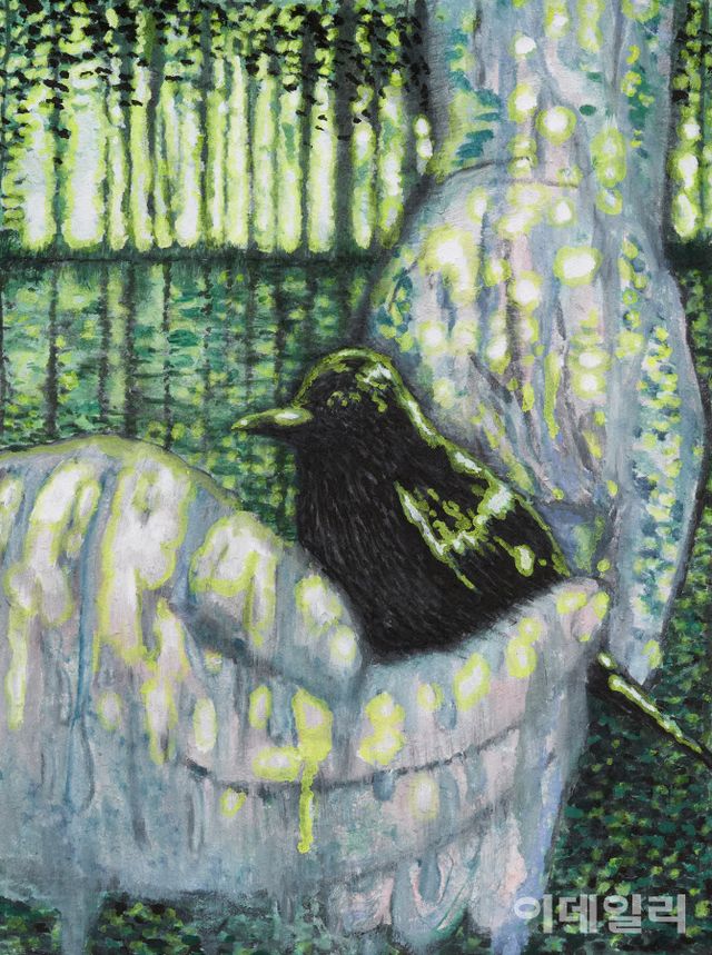 [이데일리 오현주 문화전문기자] 손길이 많이 간듯, 잘 다듬은 화초가 돋보이는 화분이 나란히 놓인 테이블. 슬쩍 보이는 창문이 아니어도 집밖이 아닌 집안의 공간처럼 보인다. 붉은 열매와 하얀꽃, 뾰족한 초록잎 분재가 적절하게 어우러져 있다. 그런데 단순히 정물화적 구상은 아닌가 보다. 슬쩍 들여다본 작품명이 ‘실내에서 나무와 새를 기르는 방법’(2024)이니까. 예쁘고 참한 전경을 옮겨다 놓은 그 이상의 의도가 숨어 있는 듯하단 얘기다.