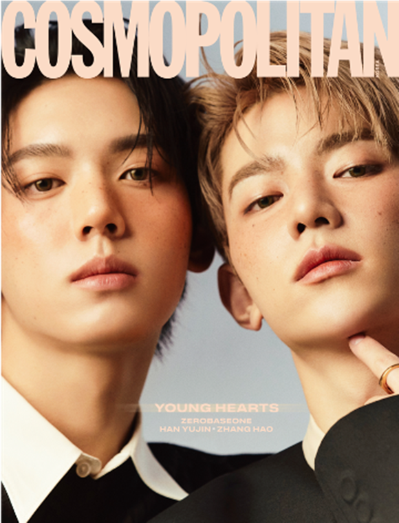 제로베이스원 한유진(왼쪽)과 장하오가 코스모폴리탄 4월호 커버를 장식했다. /제로베이스원