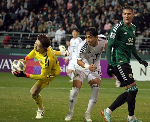 지난 5일 전주월드컵경기장에서 열린 전북 현대와 울산 HD의 아시아축구연맹 챔피언스리그 8강 1차전에서 울산 골키퍼 조현우가 공을 잡아내고 있다. / 연합뉴스