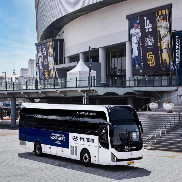현대자도차가 ‘메이저리그(MLB) 월드투어 서울 시리즈’ 운영차량으로 지원하는 수소상용차 유니버스 수소전기버스. / 현대차 제공