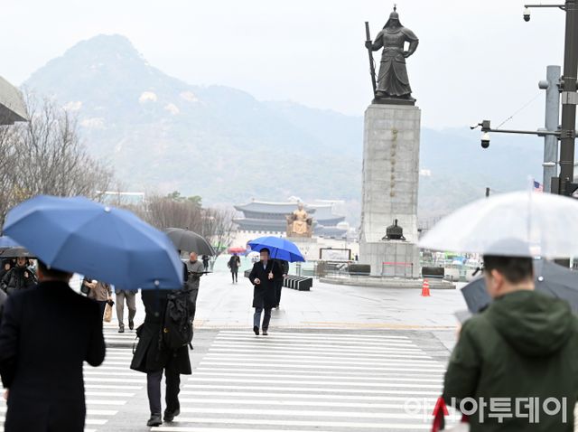 아시아투데이 박성일 기자 = 19일 오전 비오는 광화문 광장에 우산을 쓰고 걷는 시민들.