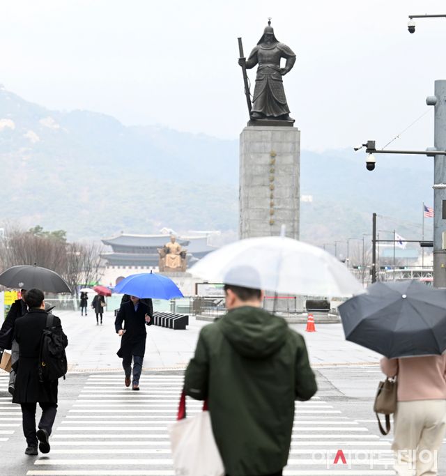 아시아투데이 박성일 기자 = 19일 오전 비오는 광화문 광장에 우산을 쓰고 걷는 시민들.