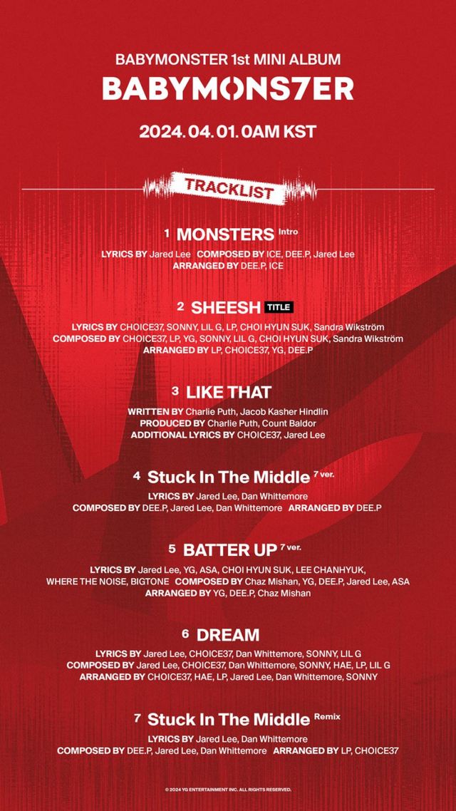 YG엔터테인먼트는 20일 공식 블로그에 ‘BABYMONS7ER’ 트랙리스트를 게재했다. 강렬한 레드 컬러 배경 위를 수놓은 첫 번째 미니 앨범의 7개 트랙은 타이틀곡 ‘쉬시’를 비롯해 ‘라이크 댓’, ‘스턱 인 더 미들’ 7인 버전, ‘배터 업’ 7인 버전, ‘드림’, ‘스턱 인 더 미들’ 리믹스 등 힙합부터 발라드까지 다채로운 장르의 음악들로 가득 채워졌다.