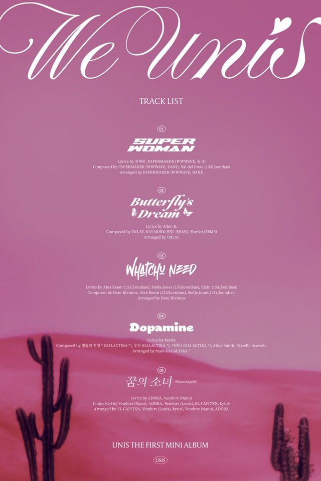 유니스의 데뷔 앨범에는 타이틀곡 'SUPERWOMAN'을 포함해 'Butterfly’s Dream(버터플라이즈 드림)', 'Whatchu Need(왓츄 니드)', 'Dopamine(도파민)', '꿈의 소녀(Dream of girls)'까지 총 다섯 곡이 수록된다.