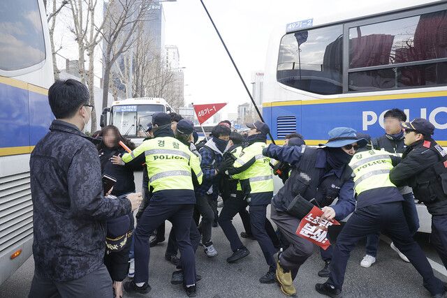 금속노조는 이날 중구 숭례문 인근에서 윤석열 정부의 노조 탄압을 규탄하는 '2024년 투쟁선포식'을 진행했다. 이들은 경찰이 신고된 목적지에 이르기 전 진로를 차단해 몸싸움이 발생했다고 주장했다.