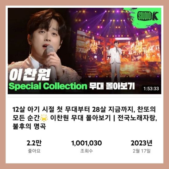 지난 2023년 2월 17일 유튜브 'KBS 레전드 케이팝'에는 "이찬원 무대 몰아보기 | 전국노래자랑, 불후의 명곡"이라는 제목의 영상이 게재됐다.