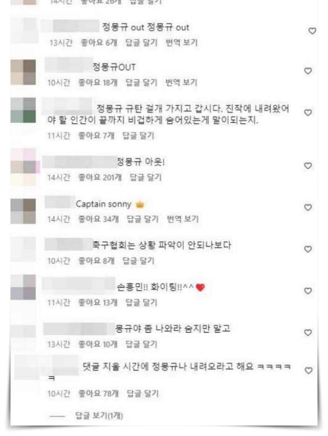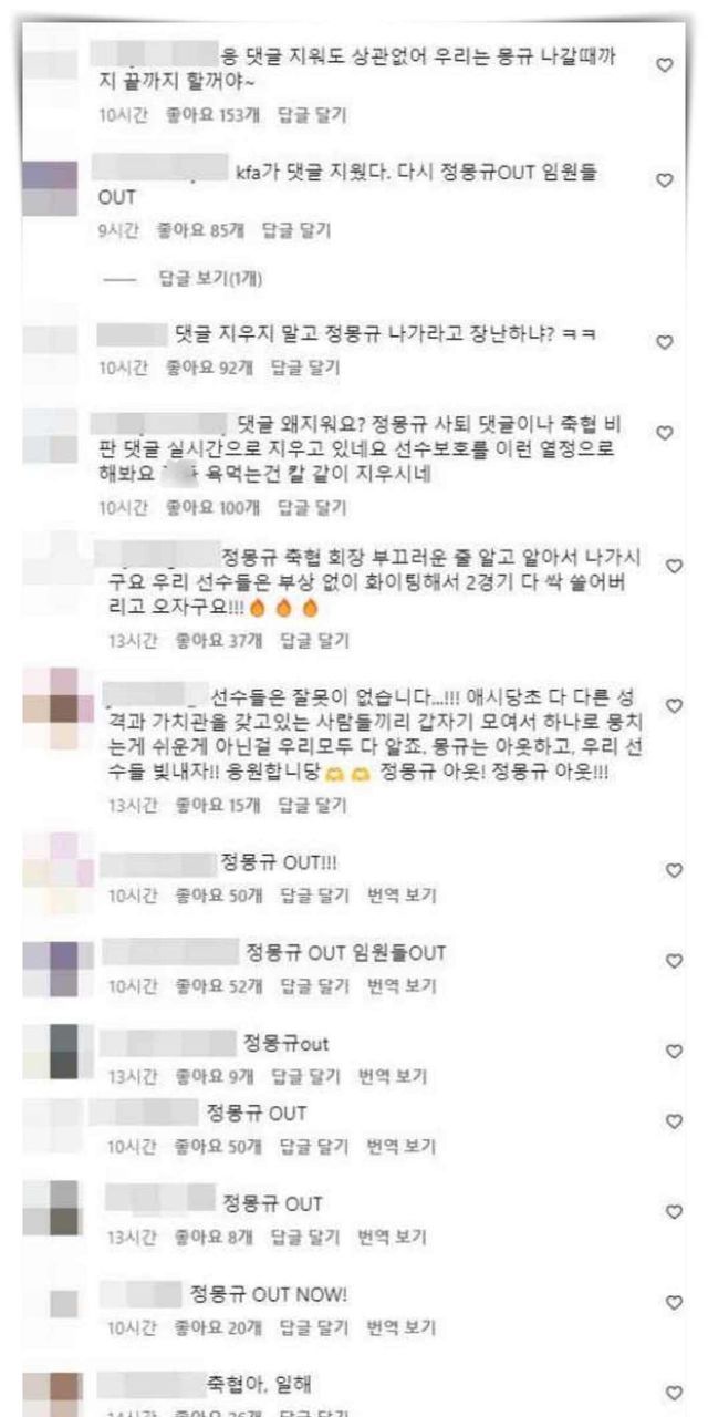 실제로 축구협회 공식 인스타그램 댓글창에는 "응 댓글 지워도 상관 없어. 우리는 정몽규 회장 나갈때까지 끝까지 할꺼야" "댓글 지우지 말고 정몽규 나가라고" "정몽규 축협 회장 부끄러운 줄 알고 알아서 나가셔라" "댓글 왜 지우나? 정몽규 사퇴 댓글이나 축협 비판 댓글 실시간으로 지우고 있다. 선수보호를 이런 열정으로 해봐라. 본인들 욕먹는 건 칼 같이 지우시네" "kfa가 댓글 지웠다. 다시 정몽규 OUT 임원들 OUT" "정몽규out" "제발 정몽규 회장 좀 나가주면 안 되겠니" "축구협회는 상황 파악이 안 되나보다" "선수분들 화이팅이다. 정몽규는 나가라" "대표팀 선수들 미래를 위해 정몽규 회장은 빠른 사퇴가 정답이다! 존대하기도 싫다" 등의 말들이 쏟아졌다. 죄다 정몽규 회장에 대한 비판, 비난 여론들이었다.