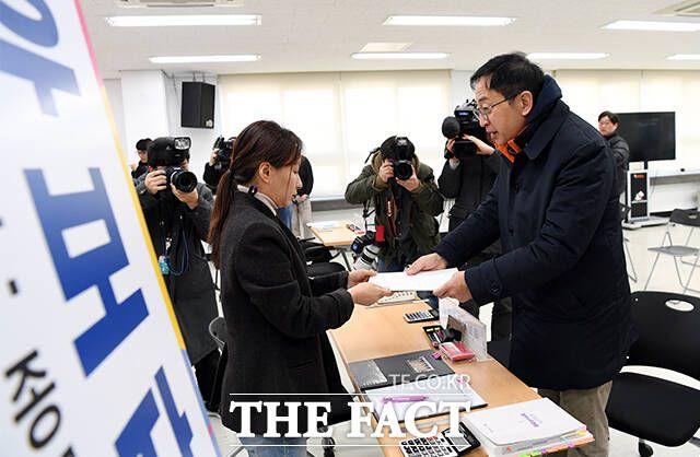 제22대 총선 서울 종로구에 출마하는 금태섭 개혁신당 후보(오른쪽)가 제22대 국회의원 선거 후보자 등록 첫날인 21일 오전 서울 종로구 창경궁로 종로구선관위원회에서 후보자 등록을 하고 있다. /임영무 기자
