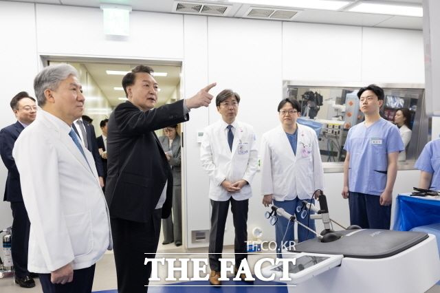 윤석열 대통령은 21일 원주의 의료기기 혁신 클러스터 조성을 적극 지원하겠다고 밝혔다. 지난달 1일 경기 성남 분당서울대학교병원 헬스케어혁신파크에서 병원 내 임상실습을 위한 스마트 시뮬레이션센터를 방문하고 있다. /대통령실 제공