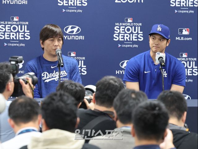 한국에서 사상 최초로 열리는 미국프로야구 메이저리그(MLB) 정규시즌 개막전을 앞두고 LA다저스가 16일 오후 고척스카이돔에서 훈련했다. 훈련전 오타니 쇼헤이, 무키 베츠, 프레드 프리먼이 기자회견했다. 오타니와 통역 미즈하라 잇페이가 나란히 앉아있다. 고척돔=정시종 기자 capa@edaily.co.kr