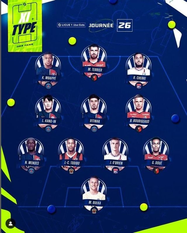 26라운드 베스트11에는 이강인 외에도 왼쪽 측면 공격수에 킬리안 음바페, 중앙 미드필더에 비티냐, 왼쪽 풀백 자리에 누누 멘드스까지 PSG 선수 4명이 뽑혔다.