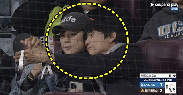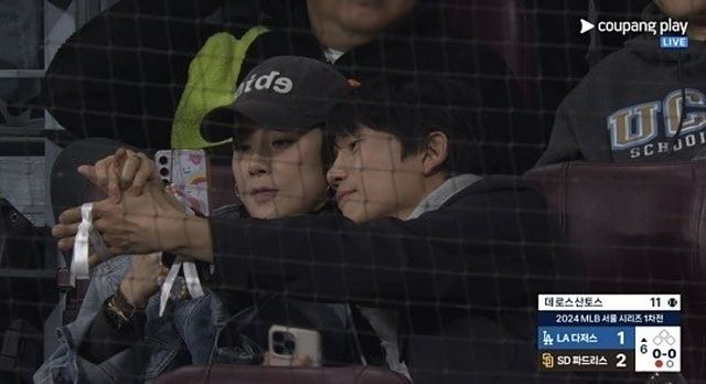 20일 서울 구로구 고척스카이돔에서 열린 2024 미국프로야구 메이저리그(MLB) 개막전을 직관한 배우 지성-이보영 부부. 쿠팡플레이 중계 화면에 잡힌 모습 / 쿠팡플레이