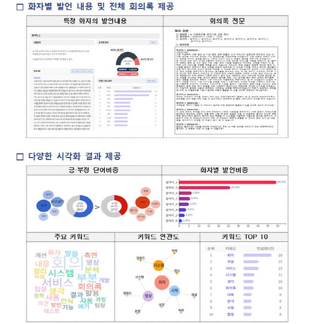 사용자는 회의 영상·음성 파일을 업로드하는 것만으로도 회의 내용을 손쉽게 확인할 수 있으며, 영상회의의 경우 별도 음성 추출 과정을 거칠 필요가 없는 것도 특징이다. 1시간 분량의 회의 영상 또는 음성 파일을 보고서 형태로 제공하는 데까지는 약 5분 가량이 소요된다. 이와 함께 회의 분위기 등을 입체적으로 쉽게 파악할 수 있도록 주요 키워드의 발생 빈도, 참석자별 발언 비중, 회의 상황까지 시각화한 결과도 확인할 수 있다.