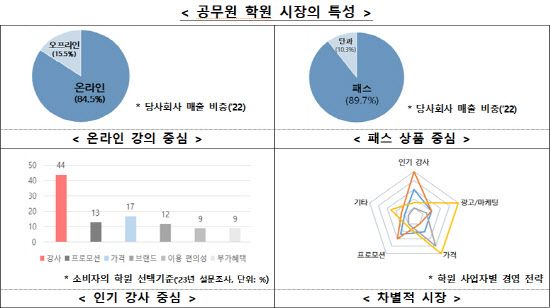공무원 학원 시장은 △온라인 강의 △패스(PASS) 상품 △인기 강사가 중심인 시장으로 학원별로 인기 강사 보유 여부 등에 따라 패스 상품의 구성과 경쟁 전략에 큰 차이를 보이는 특징이 있다. 이 같은 특성으로 인기 강사를 많이 보유한 사업자일수록 패스 상품의 경쟁력이 강화되고 수험생을 더욱 많이 유인할 수 있어 시장 지위를 더욱 강화할 수 있게 된다.