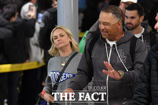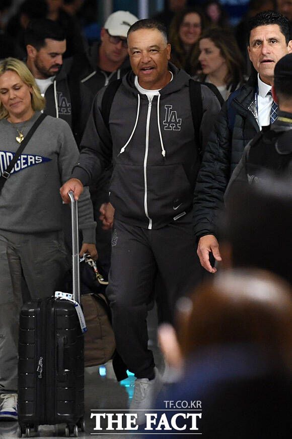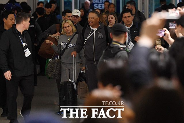 [더팩트ㅣ인천국제공항=남용희 기자] 미국 메이저리그(MLB) '월드투어 서울 시리즈'를 끝낸 LA다저스 데이브 로버츠 감독(오른쪽)이 22일 새벽 인천국제공항을 통해 출국하며 팬들에게 인사를 하고 있다.