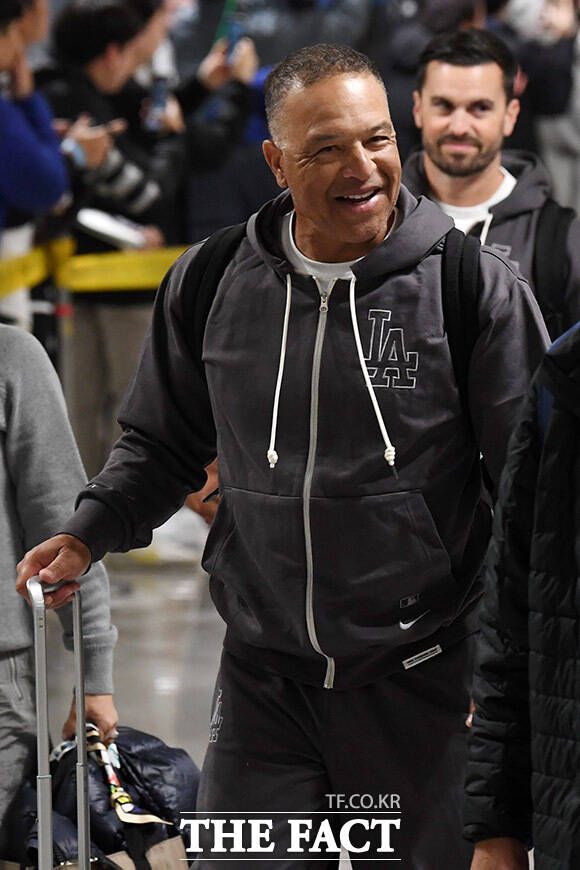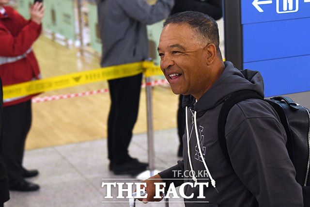 환한 미소 지으며 출국하는 로버츠 감독.