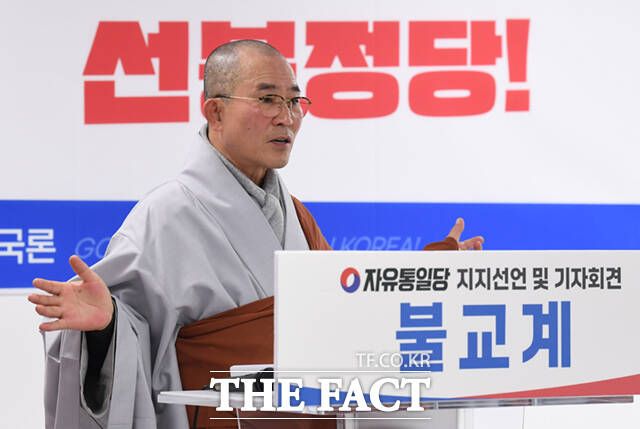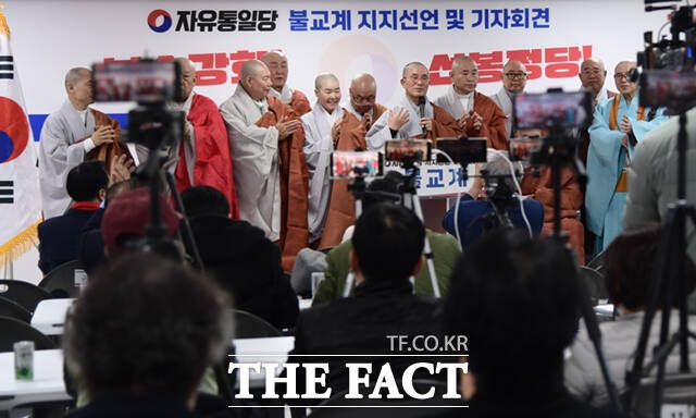 '대한민국을 지키는 불교계'라고 지칭한 이들은 "우리 불교계는 대한민국이 처한 엄중한 국가적 위기상황을 심각하게 인식하고 있다"며 "이에 이 위기를 극복하고 그 대안을 제시할 수 있는 유일한 정당이 자유통일당이라고 확신한다"고 밝혔다.