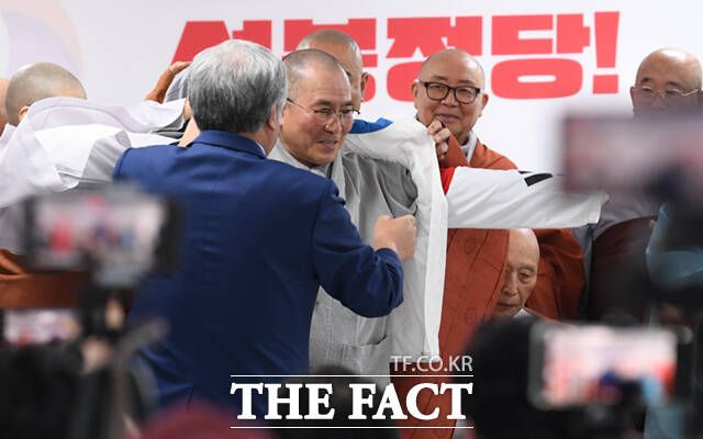 [더팩트ㅣ이새롬 기자] 대한불교호국 총연합대표인 응천스님을 비롯한 일부 승려들이 22일 오전 서울 여의도 자유통일당 중앙당사에서 입당을 선언하며 지지 선언문을 낭독하고 있다.