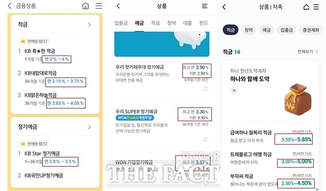 금융당국의 예금성 상품 금리 관련 광고 가이드라인에 따르면 예·적금 상품은 최고금리 광고 시 기본금리를 함께 표시해야 한다. 왼쪽부터 KB국민은행, 우리은행, 하나은행의 예적금 상품 화면의 모습. /각사 앱 화면 캡처