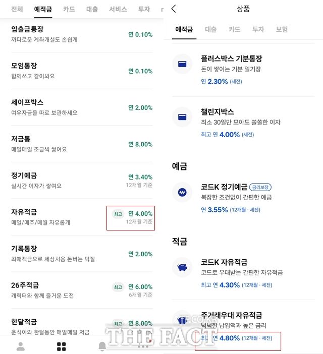 카카오뱅크와 케이뱅크 등 일부 은행에서 기본금리를 빼고 최고금리만을 표시하는 등 금융당국이 지시한 가이드라인을 지키지 않고 있는 것으로 나타났다. 왼쪽부터 카카오뱅크 예적금 상품 화면, 케이뱅크 예적금 상품 화면. /카카오뱅크·케이뱅크 애플리케이션(앱) 화면 캡처