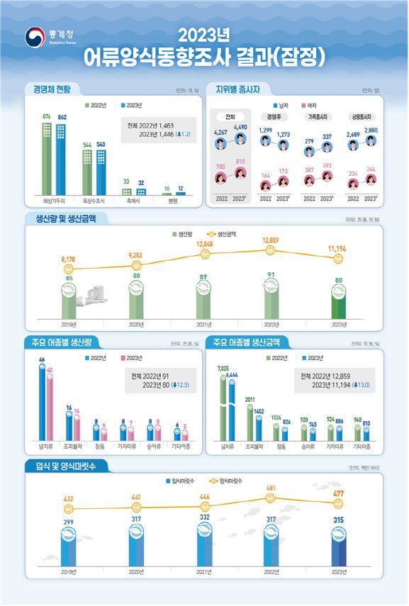 22일 통계청의 ‘2023년 어류양식동향조사 결과(잠정)’에 따르면 지난해 어류양식 생산량은 8만t(톤)으로 전년 대비 12.5%(1만1000t) 줄어들었다. 전체 생산량이 줄어든데다가 출하 가격이 떨어지며 어류양식 생산금액은 1조1194억원으로, 전년 대비 13%(1666억원) 감소했다.