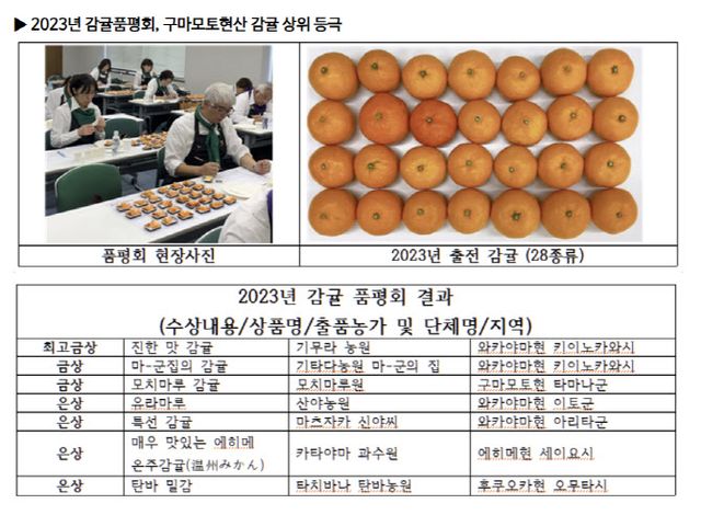 일례로 지난해 12월에 개최된 감귤선수권의 결과는 화제를 모으기도 했다. 2021년 제 1회, 2022년 제 2회 품평회에서는 와카야마현산 감귤이 상위를 독점하였으나 지난해는 구마모토현산 감귤이 상위권에 진입했다고 밝혔다.