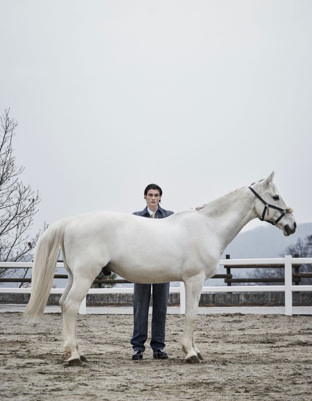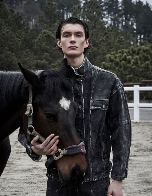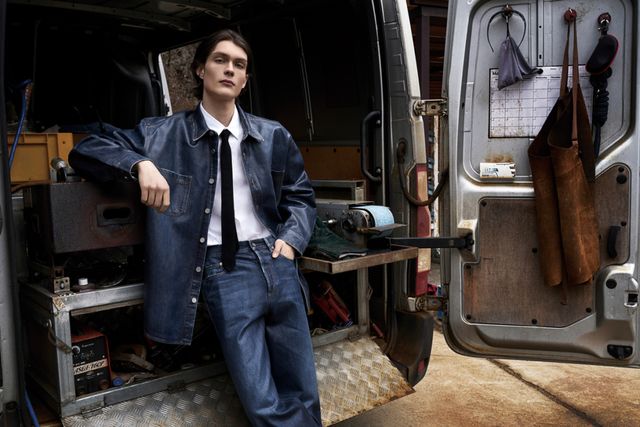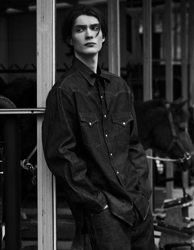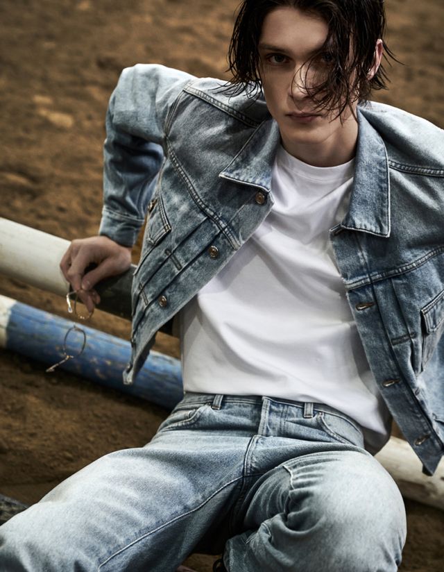 오른쪽 페이지 데님 재킷과 화이트 셔츠, 데님 팬츠, 가죽 타이, 첼시 부츠 모두 Bottega Veneta.