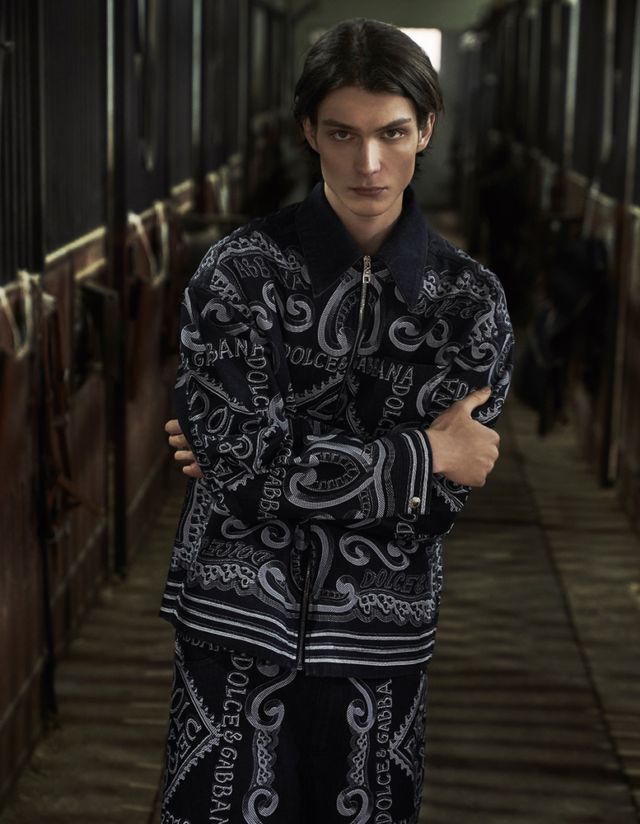 오른쪽 페이지 에스닉 프린트 데님 블루종과 쇼츠 모두 Dolce&Gabbana.