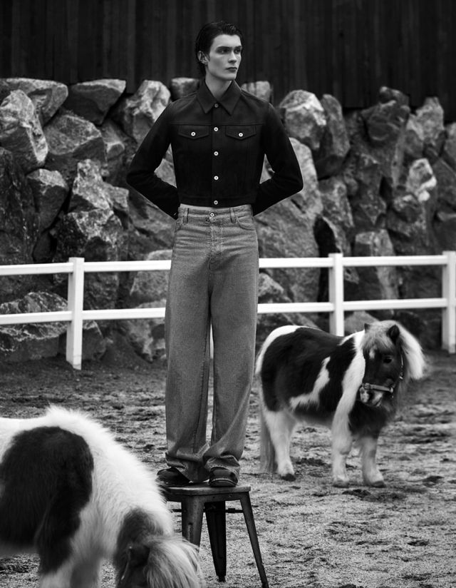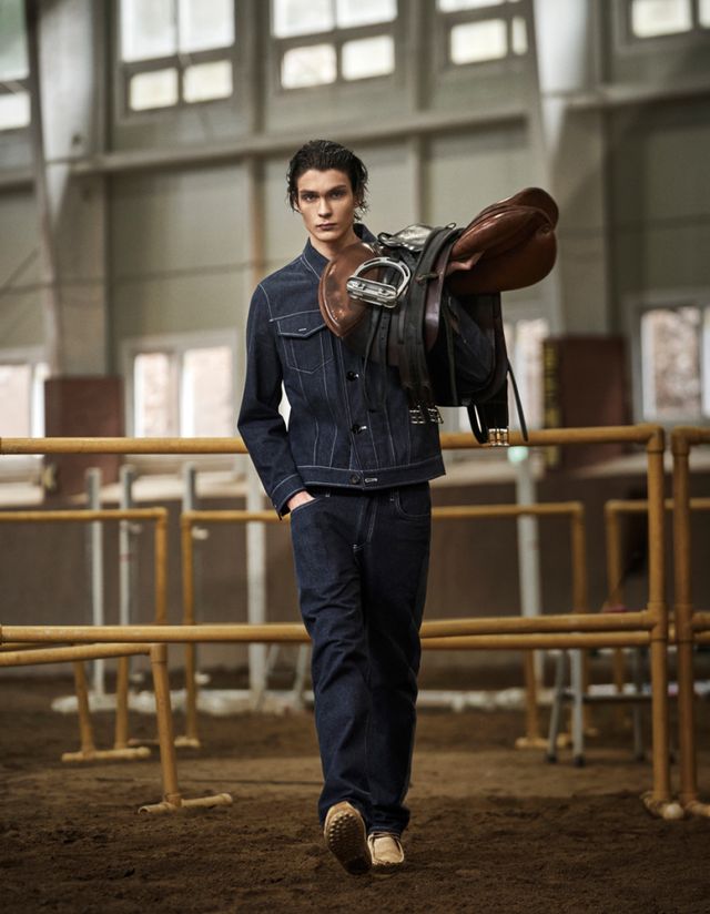 오른쪽 페이지 네이비 가죽 트러커 재킷과 스톤 장식 데님 팬츠 모두 Loewe, 블랙 슈즈 Bottega Veneta.