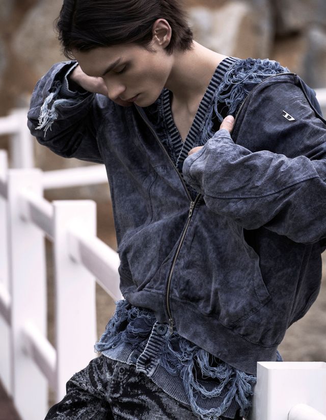 색이 바랜 듯한 블루 후드 집업 재킷과 낡은 듯 표현한카디건, 워싱 처리한 데님 팬츠 모두 Diesel.